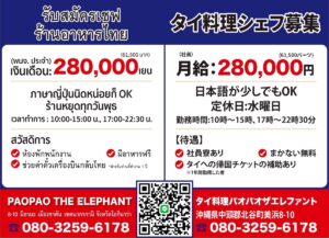 シェフ 月給25万円〜30万円(55,000BAHT〜66,000BAHT)